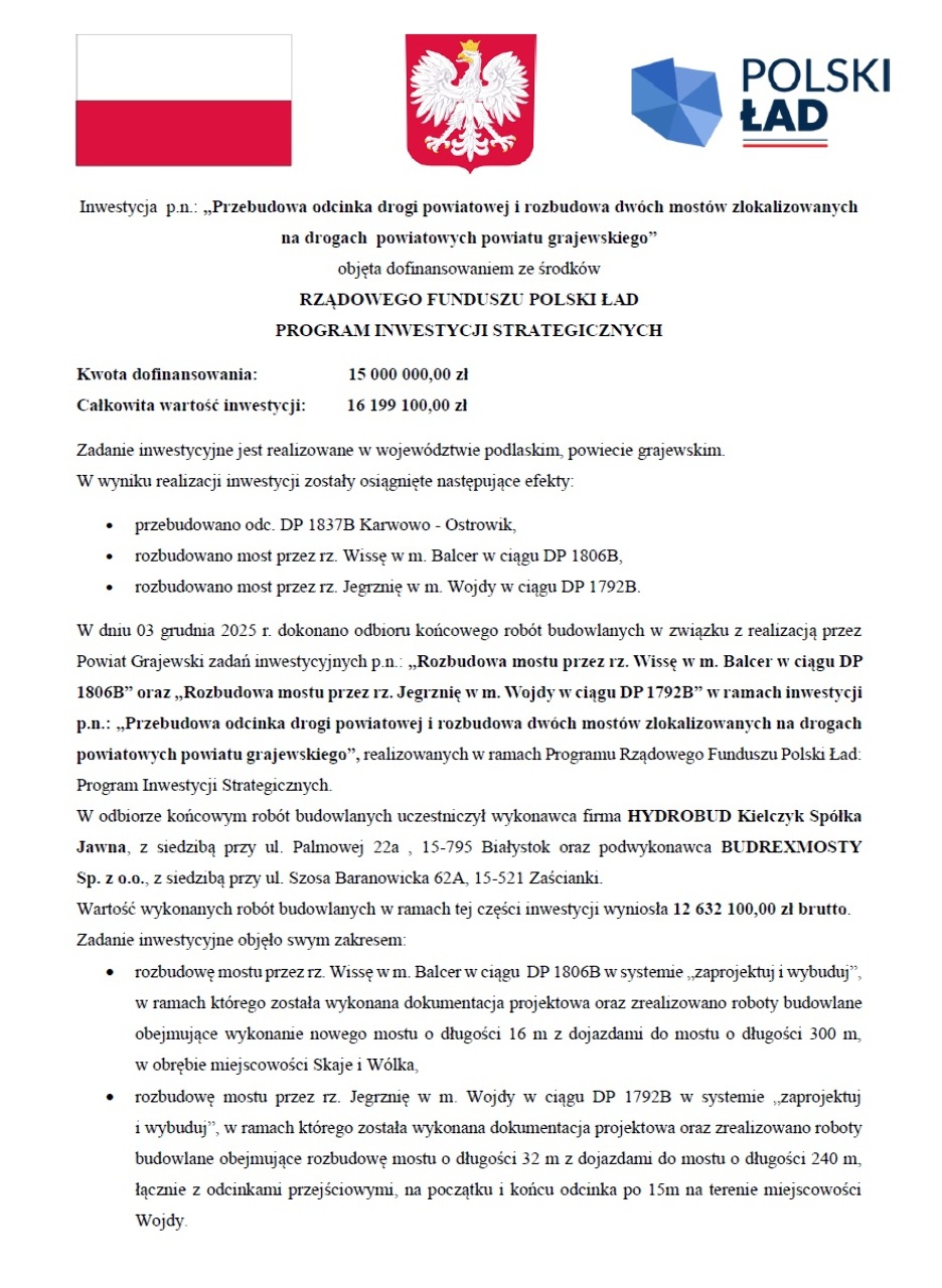 Przypominamy, iż wartość inwestycji to prawie 17 mln zł, z których na rozbudowę mostów przeznaczono prawie 13 mln zł. Na to zadanie Powiat pozyskał dofinansowanie w wysokości 15 mln zł z Rządowego Funduszu Polski Ład, Program Inwestycji Strategicznych. Pozostałe koszty pokryte zostały z budżetów Powiatu Grajewskiego, Gminy Rajgród i Gminy Szczuczyn.
