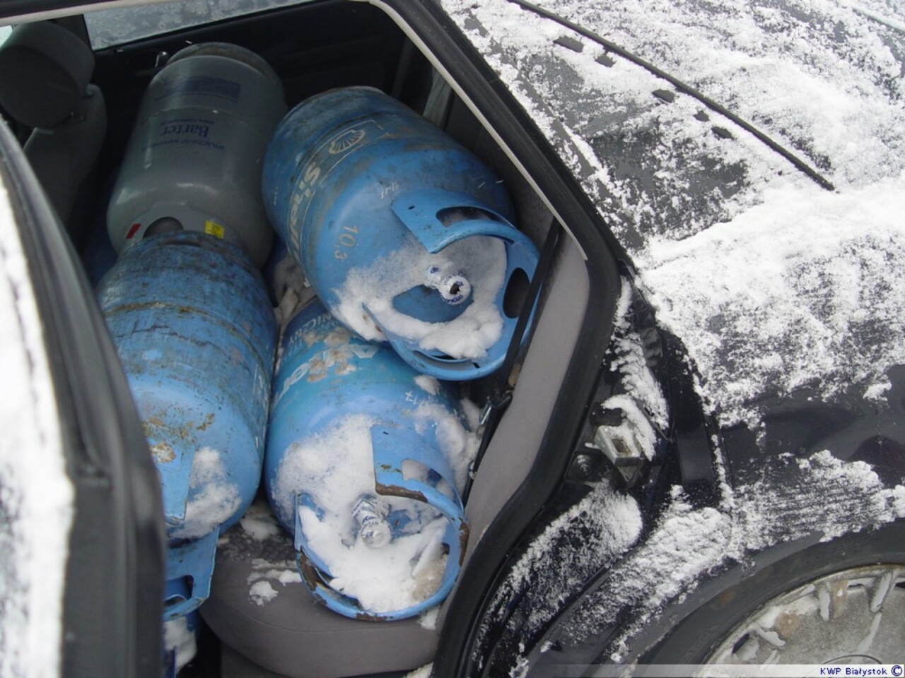 W niedzielę, po północy, dyżurny kolneńskiej Policji otrzymał zgłoszenie o tym, że nieznani mężczyźni zabierają z metalowego stojaka stojącego pod sklepem w jednej z miejscowości na terenie gm.Kolno, butle gazowe i wkładają je do samochodu. Na miejsce natychmiast pojechali policjanci. Po drodze zauważyli, że wskazany pojazd stoi w zasypanej śniegiem drodze i nikogo w nim nie ma. Już po chwili, w wyniku podjętego pościgu mundurowi zatrzymali dwóch 22-letnich mężczyzn. W samochodzie policjanci ujawnili 6 pustych butli gazowych oraz 4 wypełnione gazem o wartości około 1300 złotych. W trakcie prowadzonego postępowania w tej sprawie, wyszło na jaw, że zatrzymani mają na swoim koncie jeszcze dwie kradzieże i trzy włamania które miały miejsce w okresie od października do grudnia 2012r. Wczoraj obaj 22-latkowie przyznali się do zarzucanych im czynów. Teraz za swoje postępowanie odpowiedzą przed sądem. Za to przestępstwo grozi kara od 3 miesięcy do 5 lat pozbawienia wolności. – oficer prasowy KPP w Kolnie
