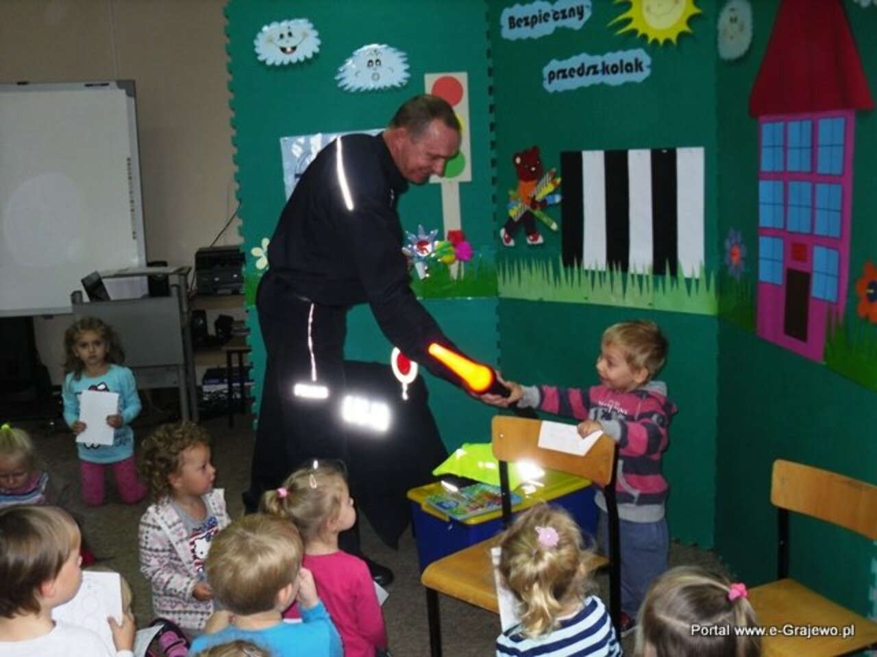 Policjant oraz pracownik cywilny Powiatowej Komendy Policji w Grajewie zapoznali przedszkolaków z zasadami zachowania się na drodze. Dzieci ćwiczyły prawidłowe poruszanie się po przejściu dla pieszych. Dowiedziały się również na czym polega praca policjanta. Szczególnym zainteresowaniem wśród dzieci cieszyła się prezentacja wyposażenia policyjnego niezbędnego podczas wykonywania służby. Na prośbę wychowawczyń Pan policjant przeczytał książkę pt. Policja autorstwa Justyny Święcickiej, z której dzieci dowiedziały się w jakich sytuacjach należy zwrócić się o pomoc do funkcjonariuszy policji. W ten sposób pomógł w realizacji programu czytelniczego „Poczytaj mi” w którym zaproszeni goście czytają książki przedszkolakom. Na zakończenie dzieci otrzymały kolorowanki.