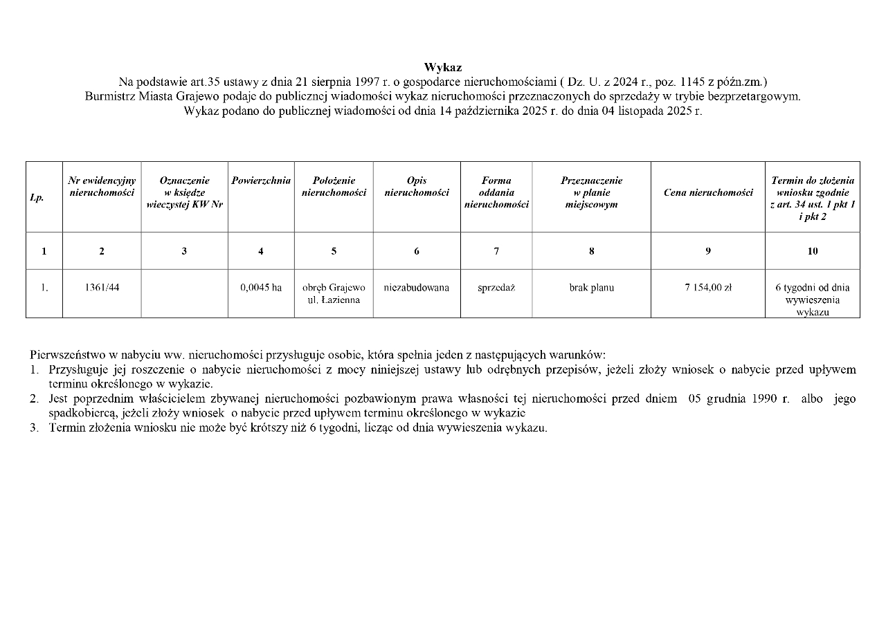 Burmistrz Miasta Grajewo podaje do publicznej wiadomości wykaz nieruchomości przeznaczonych do sprzedaży w w trybie bezprzetargowym.