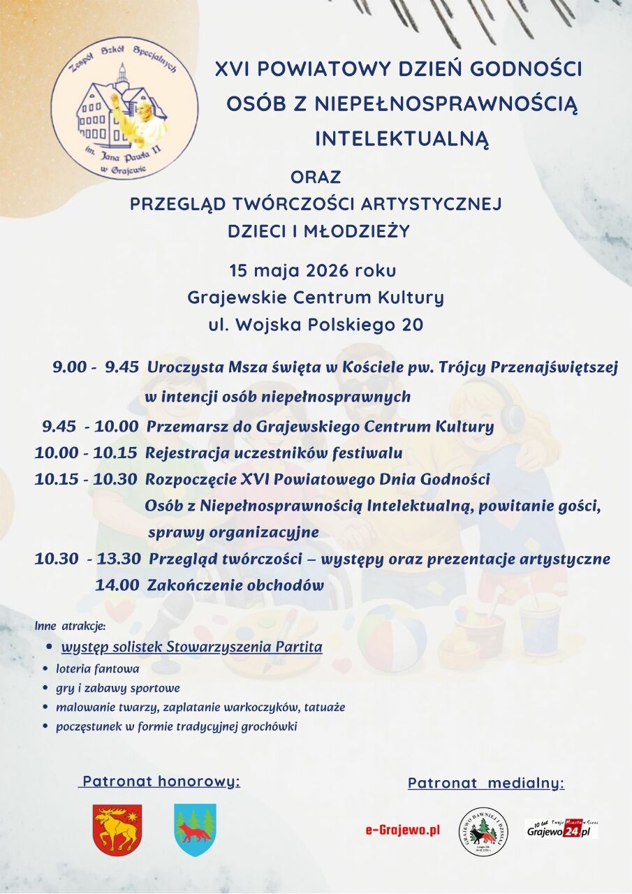 Już 15 maja 2026 roku w Grajewie odbędzie się XVI Powiatowy Dzień Godności Osób z Niepełnosprawnością Intelektualną połączony z przeglądem twórczości artystycznej dzieci i młodzieży. To wyjątkowe wydarzenie łączy ideę integracji, szacunku i prezentacji niezwykłych talentów.