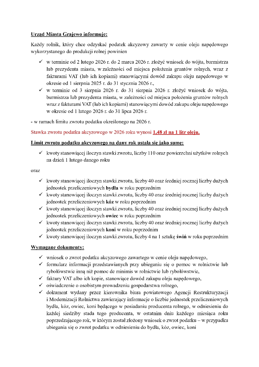 więcej tu : https://www.grajewo.pl/pl/aktualnosci/zwrot-podatku-akcyzowego.html
